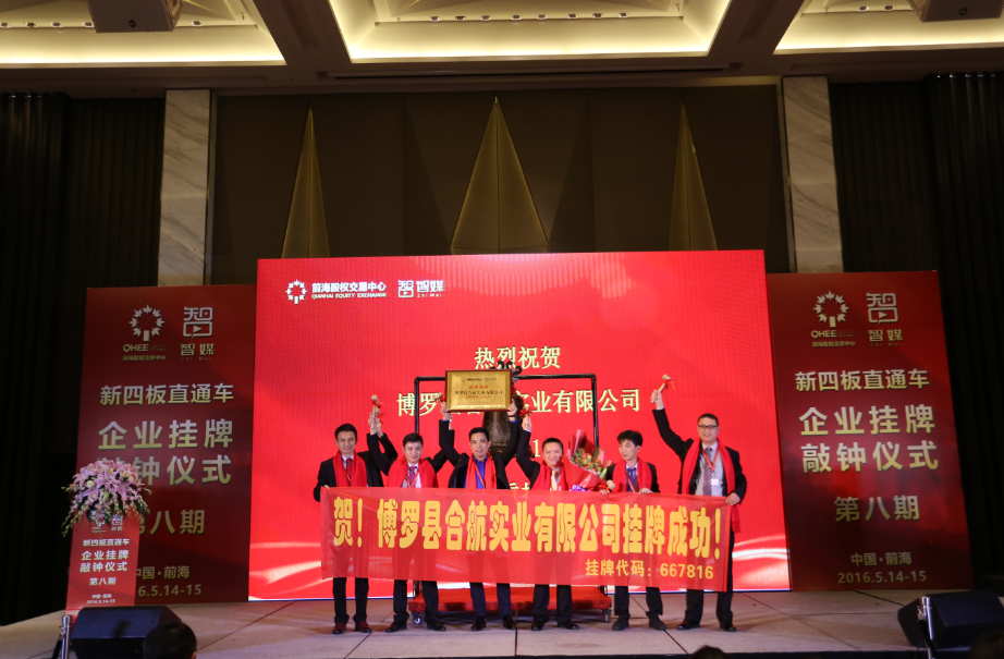 2016年5月14—15日,深圳前海JW萬豪酒店里人聲鼎沸,所有人都洋溢著期待的微笑,見證前海智媒舉辦的“新四板直通車企業(yè)掛牌敲鐘儀式”順利進(jìn)行。博羅縣合航實(shí)業(yè)有限公司董事長帶領(lǐng)團(tuán)隊(duì)參與其中,在莊嚴(yán)的授牌儀式中,正式進(jìn)軍“新四板”,企業(yè)掛牌代碼:667816。